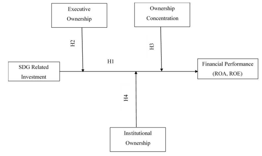 When top managers hold significant ownership stakes, they are more likely to focus on long-term, value-creating activities, like investments that align with the SDG, since their personal fortunes directly correlate with the long-term performance of the company (Gulzar et al., 2024; and Talha et al., 2025). Such Ownership motivates them to make thoughtful decisions about SDG initiatives that maximise social and financial returns (Lassala et al., 2021; Sarwar et al., 2023). In addition, owner-executives are less inclined to pursue short-termism, making them more likely to pursue SDG investments that are costly in the short term but profitable in the long term. In contrast, in low-executive-ownership firms, managers do not have incentives to pursue or manage SDG investments effectively, as they perceive them as a drag or a side activity (Jan et al., 2021). Executive Ownership thus reinforces the positive association between SDG investments and financial performance by promoting strategic fit, responsibility, and long-term value creation. Based on the literature, it can be hypothesised that;