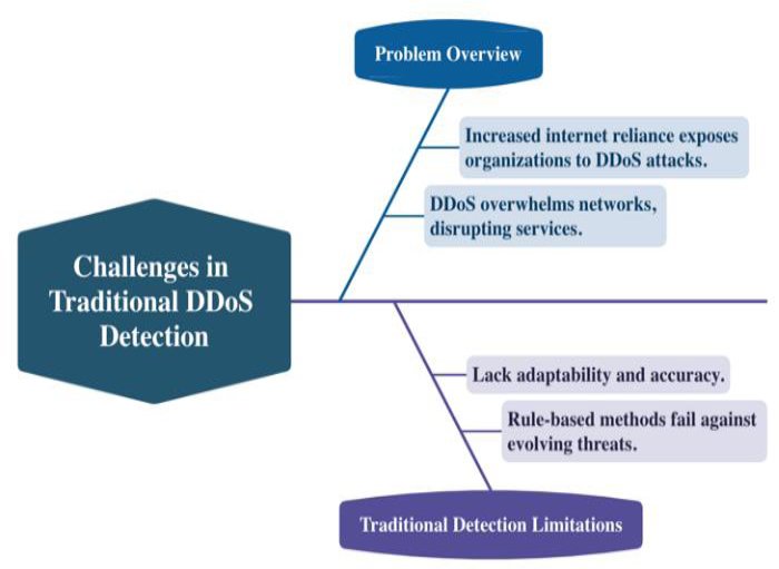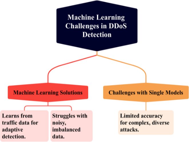 According to the analytical observations, enterprises are now facing a variety of cyberattacks. They are highly vulnerable to security threats, including disruptive DDoS attacks, due to the rapid growth of the internet and growing dependence on online resources. Attacks start with sending too much network traffic, exhausting available resources and making the target services unavailable. DDoS attacks are becoming more common and complicated, and require better protection systems that can identify malicious network traffic quickly and accurately [14]. The detection of DDoS attacks through traditional methods depends on pre-defined rule sets or signature detection, whereas these methods lack the flexibility to track emerging attack patterns and techniques [5]. Due to its self-learning functionality, machine learning adapts through past network traffic data analysis for better detection performance. Achieving high detection accuracy for DDoS attacks is complicated by their complex dynamic nature. Several attributes contribute to this complexity. First, DDoS traffic patterns are highly variable and evolve rapidly; network traffic is influenced by heterogeneous sources, fluctuating volumes, and noisy data, which add unpredictability to attack detection [6]. The detection capabilities of individual machine learning algorithms, including Decision Trees, Random Forest and Support Vector Machines, remain ineffective due to variant attack signatures found in noisy data and mismatched data distributions, as illustrated in Fig. (1).