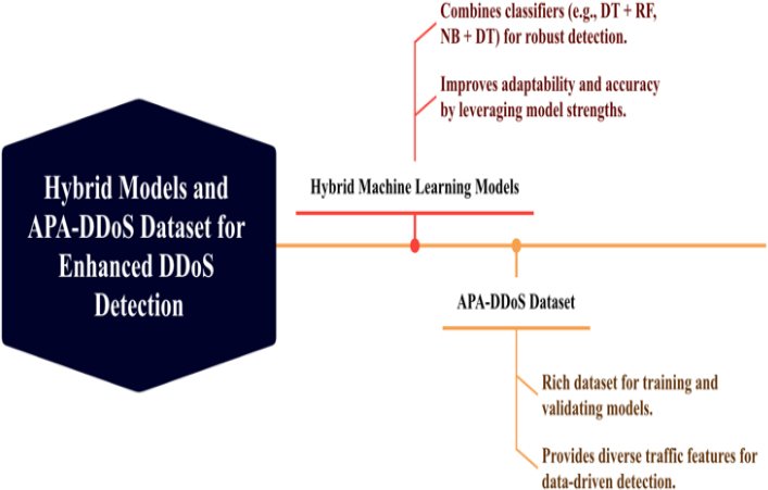 Methodology: A novel framework was created to improve the detection results, combining several machine learning models to achieve better detection results. The framework combines Support Vector Machine (SVM) with Neural Network (NN) and AdaBoost with Decision Tree, the study also combines the Decision Tree (DT) with Random Forest (RF), Gradient Boost (GB) with Random Forest, and Naive Bayes (NB) with Decision Tree. Every hybrid model improves the classification performance by utilising the advantages of each algorithm in dealing with varying patterns and noisy inputs. The APA-DDoS benchmark dataset included network traffic parameters such as source and destination IP addresses, TCP flags and packet statistics.