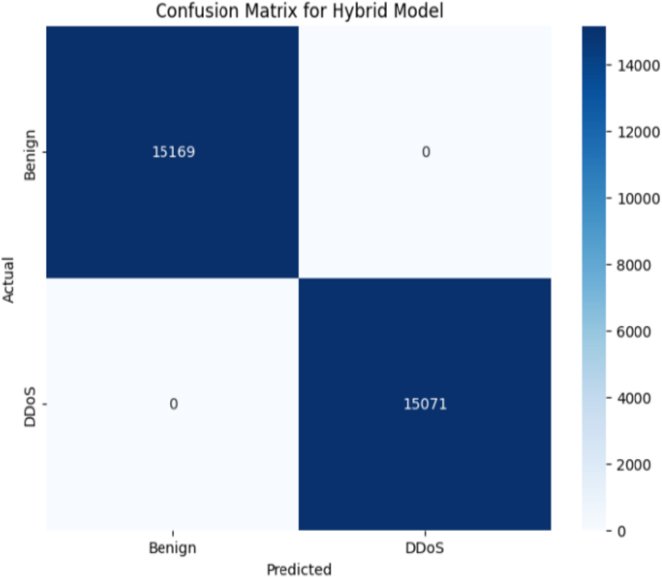 Every hybrid model generated a complete accuracy table demonstrating perfect identification capabilities. According to the experimental results, these models maintain a flawless rate of benign traffic detection but achieve complete accuracy in detecting DDoS attacks (Fig. 7).